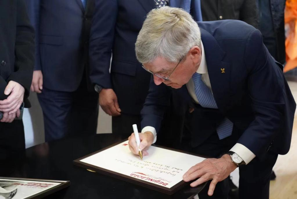 巴赫在海报上签名,并将其赠送给北京冬奥组委、北京2008年奥运会和北京2022年冬奥会的“双奥”遗产机构——北京奥运城市发展促进中心等。志愿者代表向巴赫赠送了大麦及鲜花。