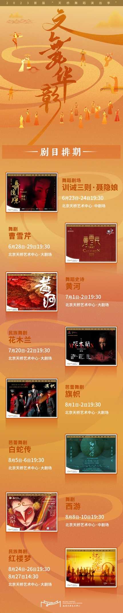 本届演出季展演包含《曹雪芹》《训诫三则·聂隐娘》《黄河》《花木兰》《旗帜》《白蛇传》《西游》《红楼梦》八部中国舞剧,邀请亚洲大美青年艺术团、郑杰舞蹈剧场、山西省歌舞剧院、宁波市歌舞剧院、广州芭蕾舞剧院、亚彬舞影工作室、江苏大剧院等演出团体,并会集黎星、郝若琦、窦率方、王亚彬、潘永超、夏天、李祎然、刘子玥、张渊博等舞者,以舞蹈语言讲述“中国故事”,展现对经典的追忆和传承。