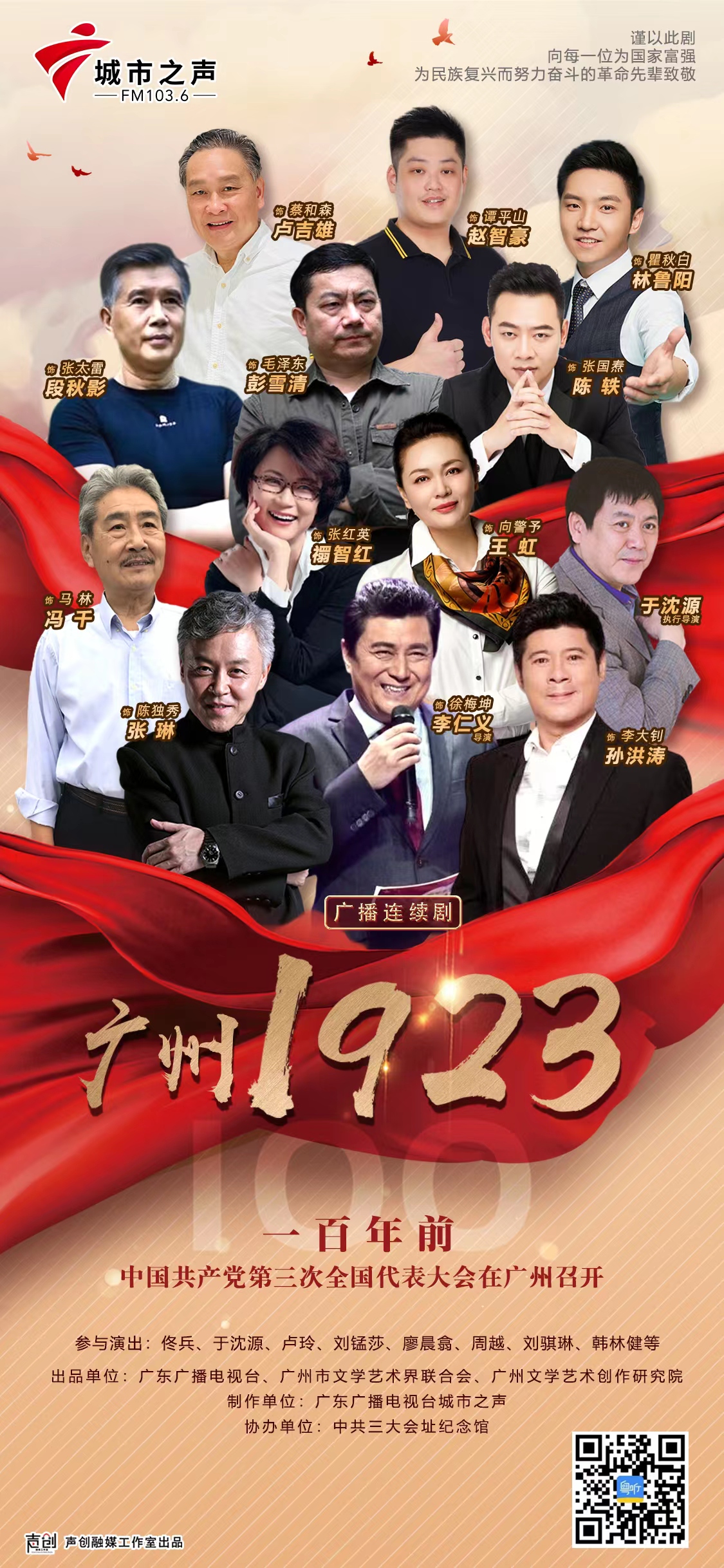 参加广播剧《广州1923》演播的演员,一共有5位国家一级演员,包括李仁义、张琳、孙洪涛、王虹、禤智红,他们有的获得中国戏剧梅花奖,有的获得中国话剧金狮奖,都是国内舞台剧、影视剧的“老戏骨”。国家一级录音师谢倍伟作为本剧的录音、配乐和合成,运用了多种声音素材,并为本剧创作了近十首音乐。