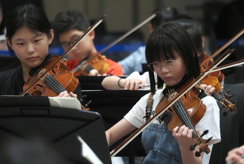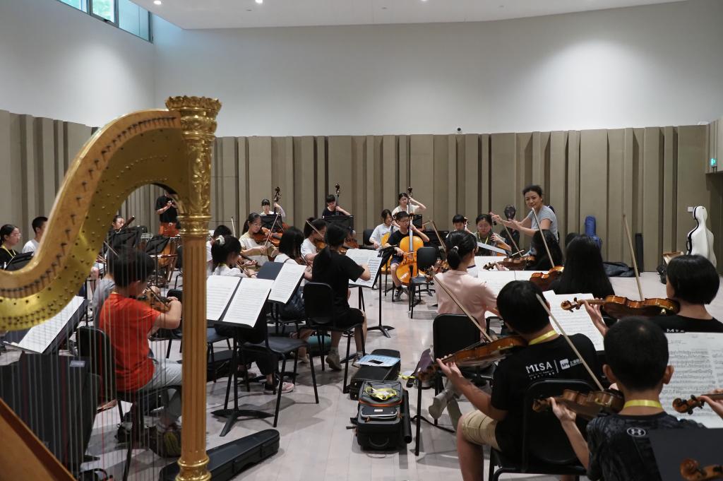 7月11日,“MISA学生节日乐团”弦乐声部的学生在进行首次联排。新华社记者 任珑 摄