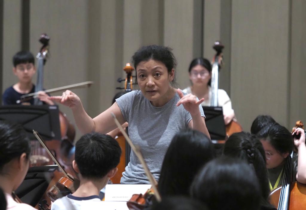 7月11日,上海交响乐团驻团指挥张洁敏在给“MISA学生节日乐团”学生进行首次联排。新华社记者 任珑 摄