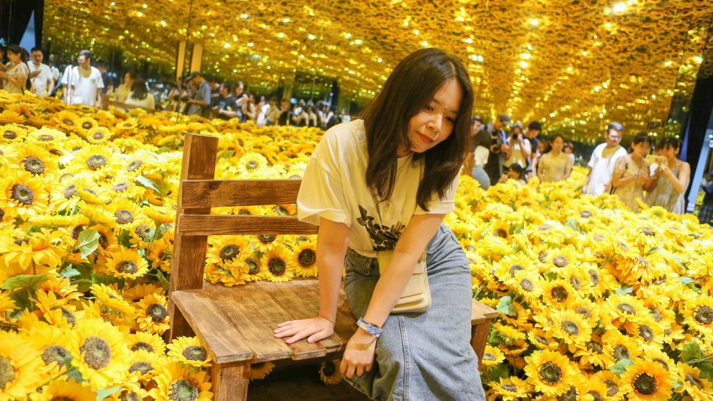 7月16日晚,参观者在“梵高再现”光影展上的向日葵镜厅拍照留念。 新华社记者 辛梦晨 摄