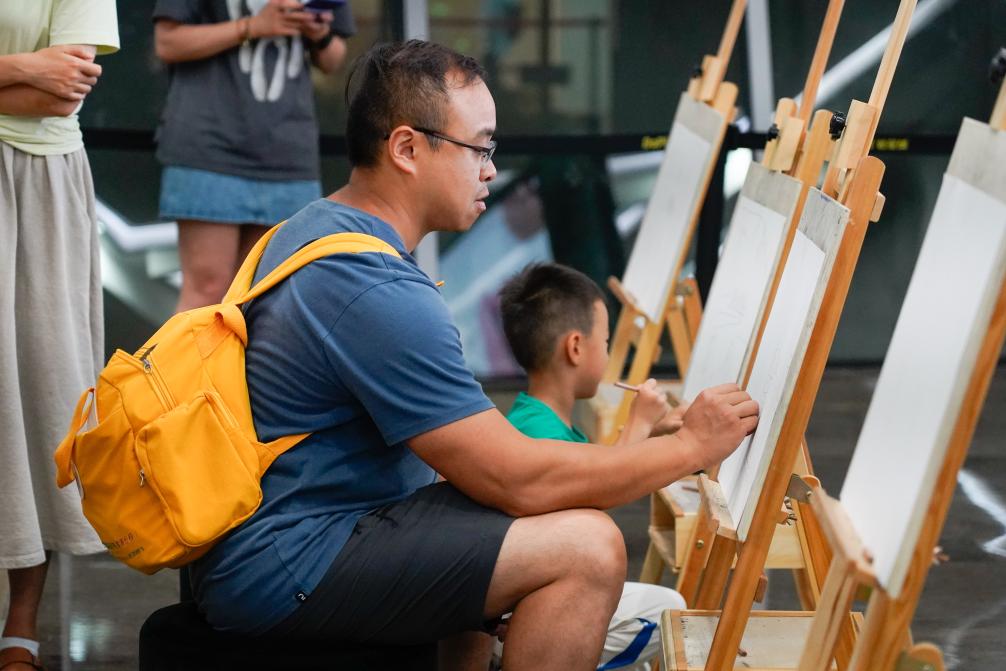 7月16日晚,参观者在世博会博物馆艺术互动区体验作画。 新华社发(李心怡 摄)