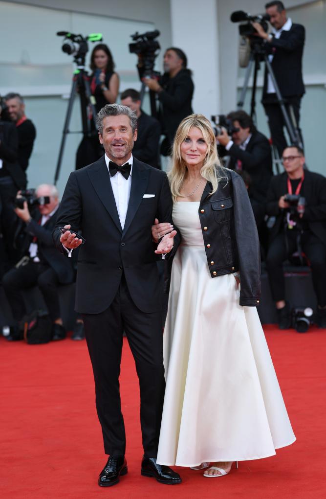 8月31日,在意大利威尼斯,电影《法拉利》演员帕特里克·登普西携妻子亮相首映式红毯。新华社记者 金马梦妮 摄