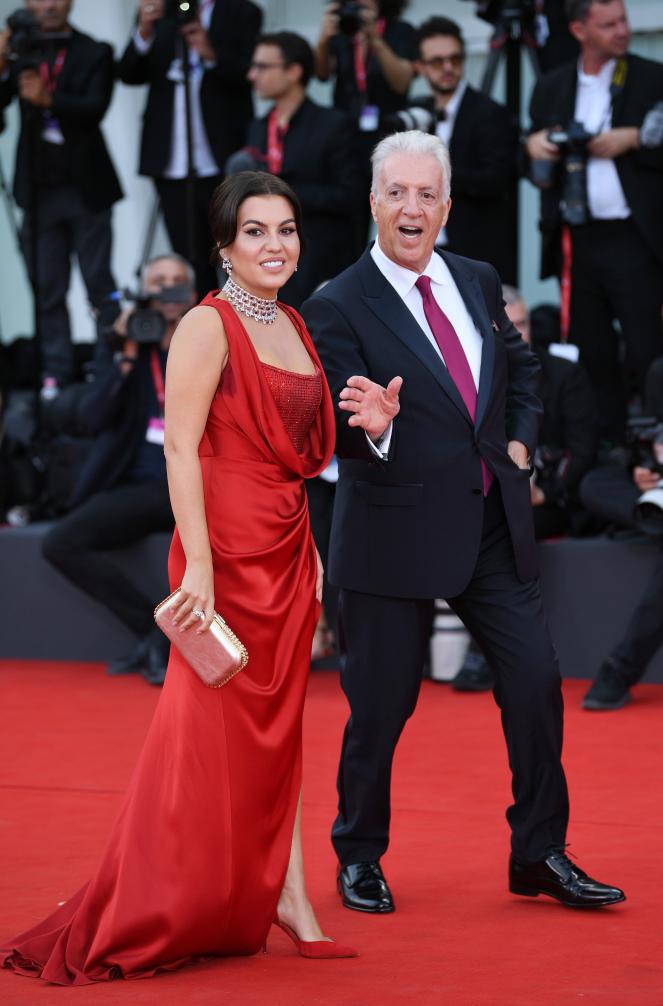8月31日,在意大利威尼斯,法拉利汽车创始人恩佐·法拉利之子皮耶罗·法拉利(右)亮相电影《法拉利》首映式红毯。