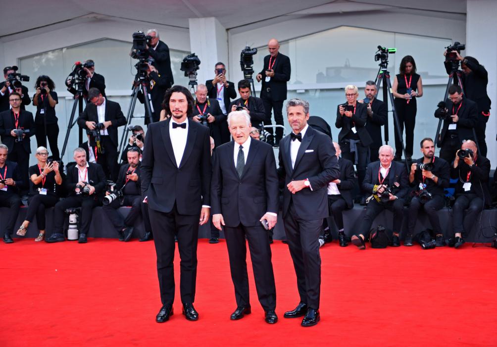 8月31日,在意大利威尼斯,电影《法拉利》导演迈克尔·曼(中)和演员亚当·德里弗(左)、帕特里克·登普西亮相首映式红毯。