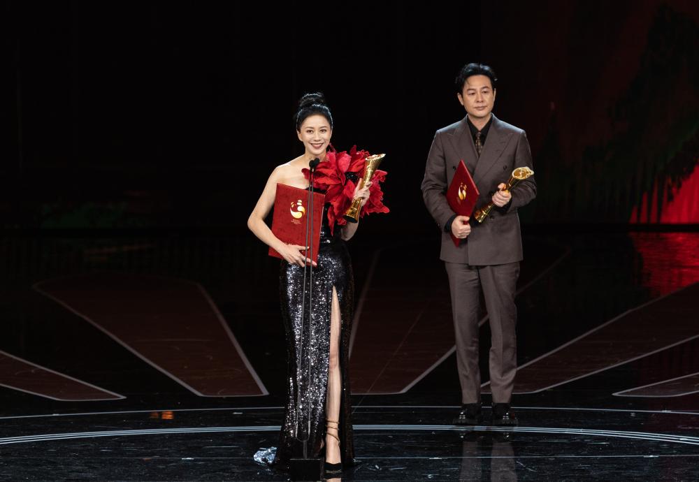 9月20日,首届金熊猫盛典上,电影单元最佳男配角奖获得者张颂文、最佳女配角奖获得者倪虹洁(左)发表获奖感言。