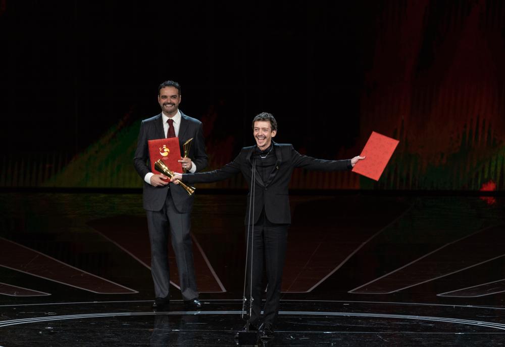 9月20日,首届金熊猫盛典上,电影单元最佳男主角奖获得者纳威尔·佩雷兹·毕斯卡亚特(右)发表获奖感言。