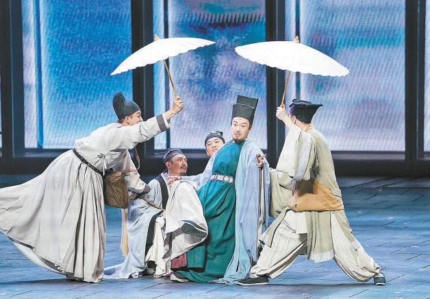 这种虚实相生的舞台手法,在《苏堤春晓》中比比皆是,充分延续了中国戏曲当中的虚拟性、假定性和游戏感,又体现出西方戏剧布莱希特“跳进跳出”的间离感,与观众产生了良好的互动,打破了历史正剧的严肃性,也恰到好处增添了时代情趣,让本性自由浪漫、幽默豁达的苏轼更具感染力,也让观众在审视与沉浸的感觉之中不停转换,从而得到更为丰富的内心体验和美学感受。
