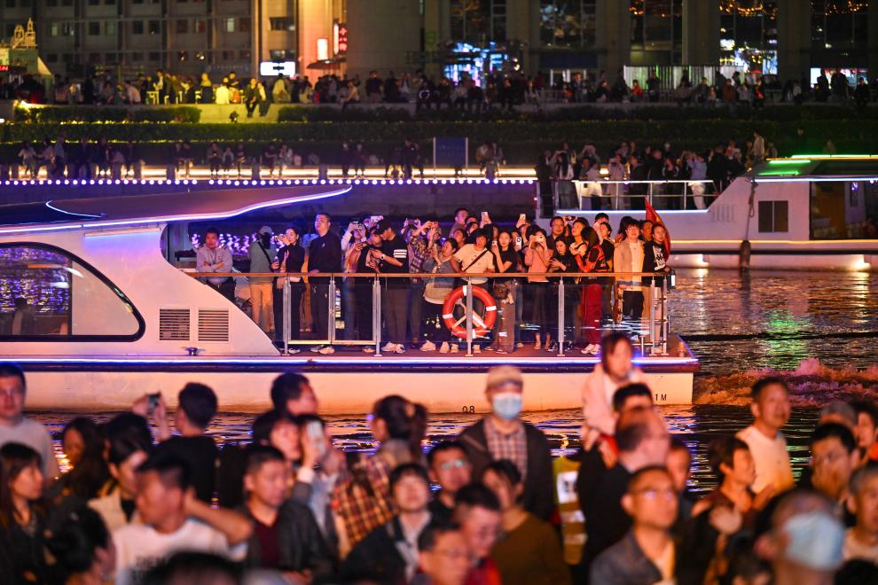 4月12日,天津市民及游客在海河两岸亲水平台及海河游船上观看桥边音乐汇演出活动。新华社记者 孙凡越 摄