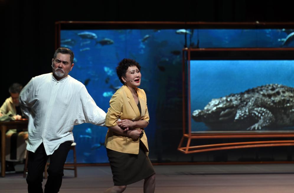 5月3日,演员赵文瑄(右)、白凯南在话剧《鳄鱼》中表演。新华社记者 金良快 摄