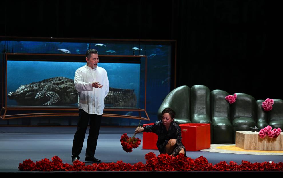5月3日,演员赵文瑄(左)、邓萃雯在话剧《鳄鱼》中表演。新华社记者 金良快 摄