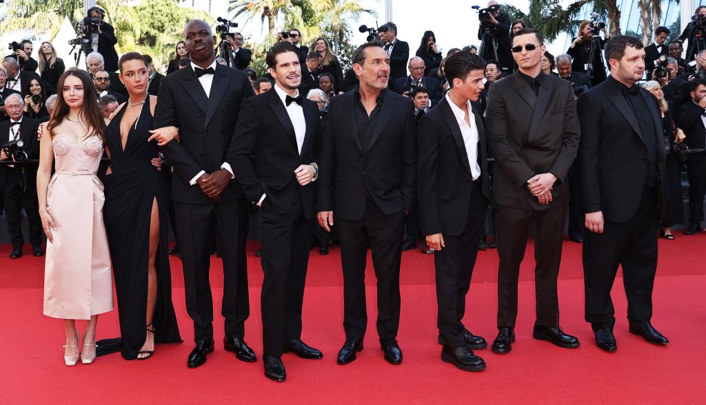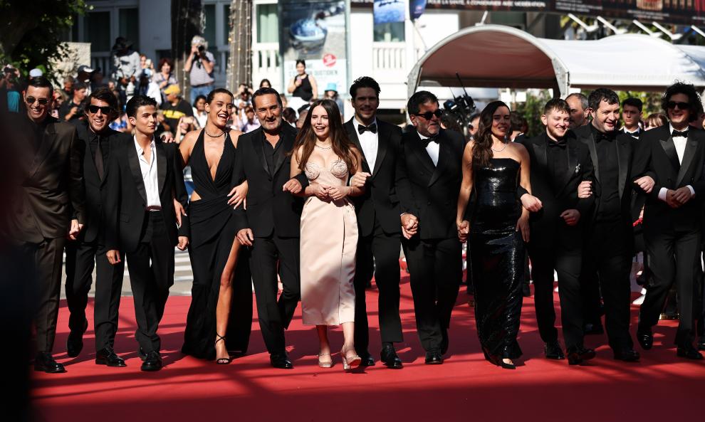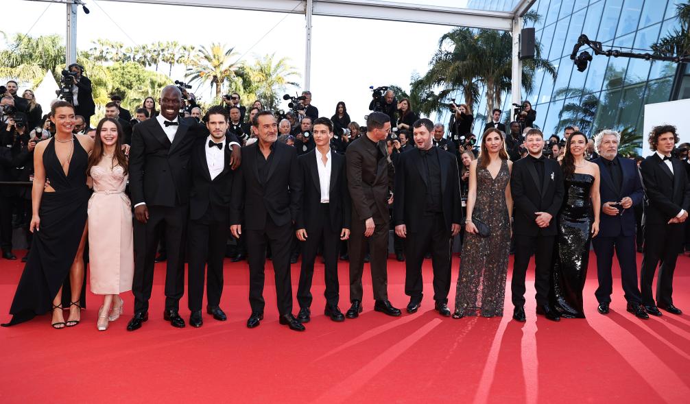 5月23日,在法国南部小城戛纳举行的第77届戛纳国际电影节上,主竞赛单元影片《狂爱》的主创人员踏上首映式红毯。新华社记者 高静 摄