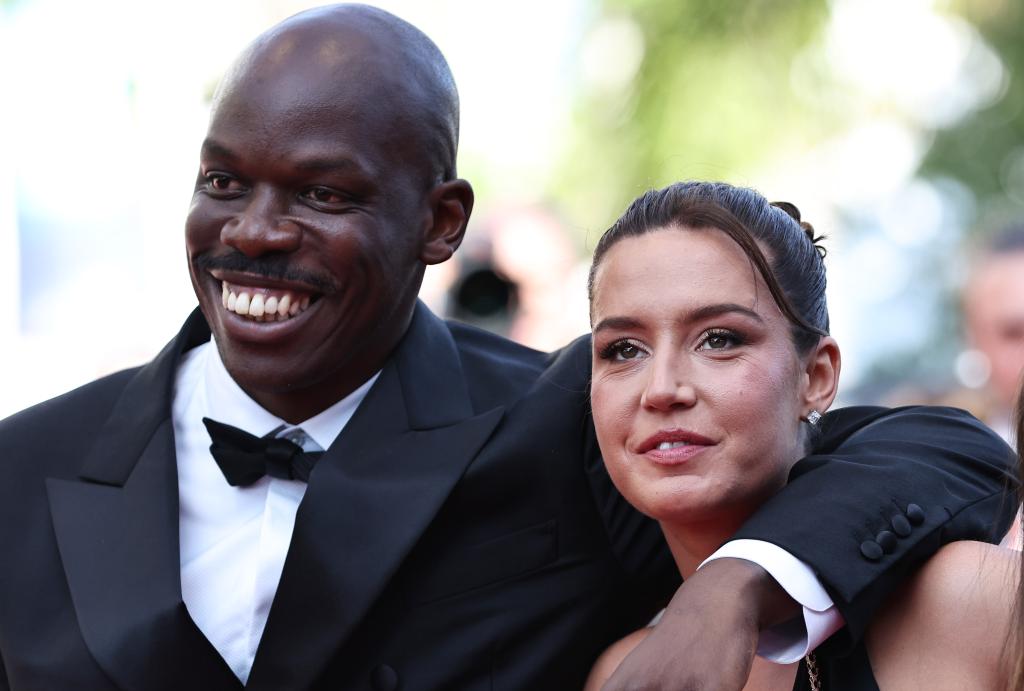 5月23日,在法国南部小城戛纳举行的第77届戛纳国际电影节上,主竞赛单元影片《狂爱》的主演阿黛尔·埃克萨霍普洛斯(右)和让-帕斯卡尔·扎迪踏上首映式红毯。新华社记者 高静 摄