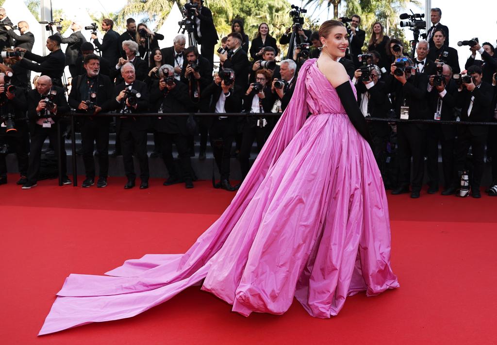 5月23日,在法国南部小城戛纳举行的第77届戛纳国际电影节上,主竞赛单元评审团主席格蕾塔·格维希踏上主竞赛单元影片《狂爱》的首映式红毯。新华社记者 高静 摄