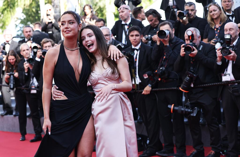 5月23日,在法国南部小城戛纳举行的第77届戛纳国际电影节上,主竞赛单元影片《狂爱》的主演阿黛尔·埃克萨霍普洛斯(左)和马洛丽·瓦奈斯克踏上首映式红毯。新华社记者 高静 摄