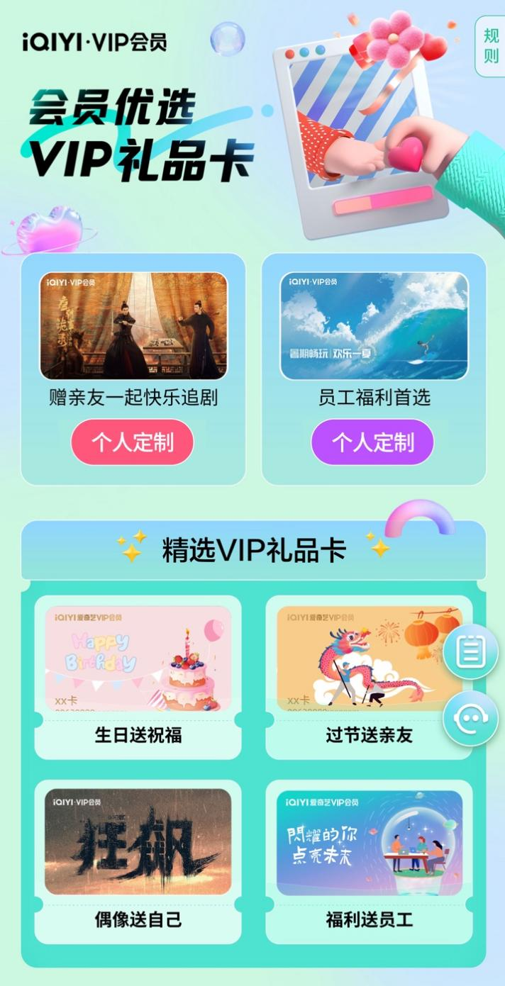 此外,爱奇艺为企业用户提供了更为多元化的会员礼品卡订购方案。对于实体礼品卡订购总量超 50 张的企业用户,爱奇艺开放了添加logo、自主定制卡号、企业自主设计卡面等功能,且批量订购可享优惠折扣。