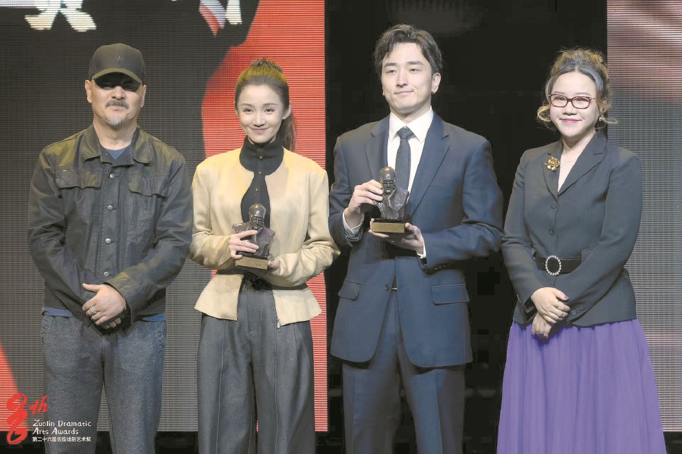 第二十六届佐临话剧艺术奖昨晚颁出,贺坪(右二)与刘晓靓(左二)分获最佳男女主角奖。 王犁摄