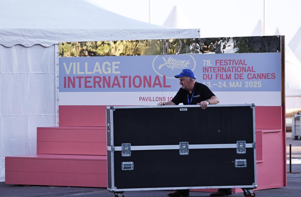 5月12日,在法国南部海滨城市戛纳,一名工作人员为戛纳电影节即将开幕忙碌。新华社记者 高静 摄