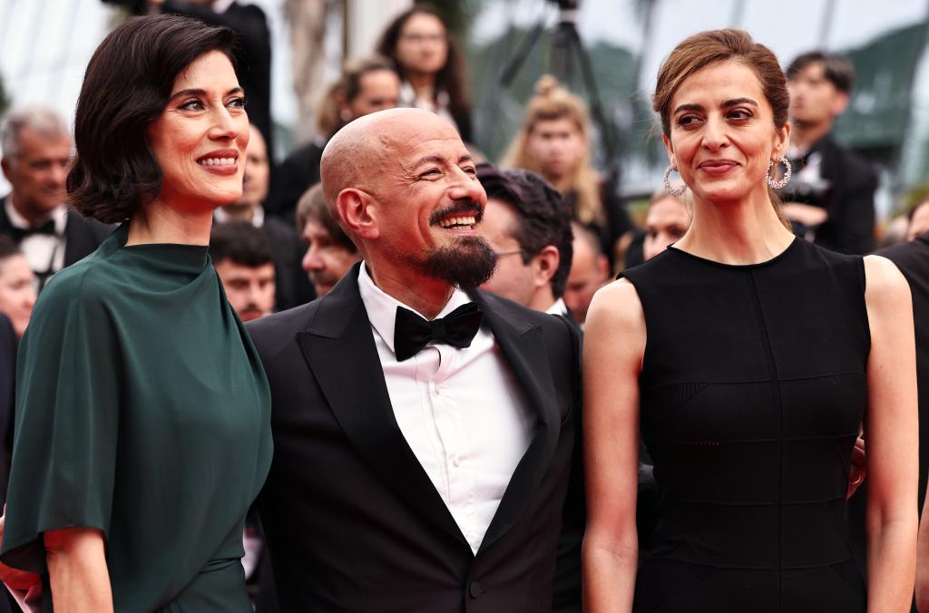 5月19日,在法国南部小城戛纳举行的第78届戛纳国际电影节上,瑞典导演塔里克·萨利赫(中)携主创人员在主竞赛单元影片《共和之鹰》首映礼后离开。新华社记者 高静 摄