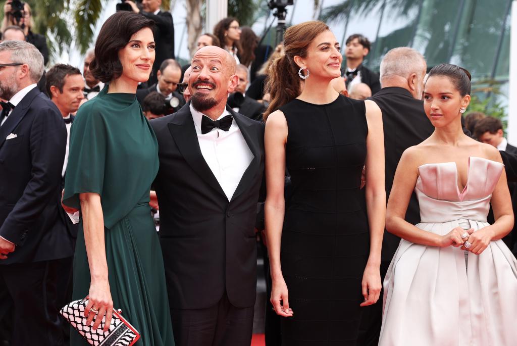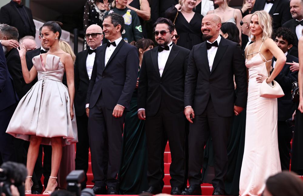 5月19日,在法国南部小城戛纳举行的第78届戛纳国际电影节上,瑞典导演塔里克·萨利赫(左二)携主创人员在主竞赛单元影片《共和之鹰》首映礼后离开。新华社记者 高静 摄