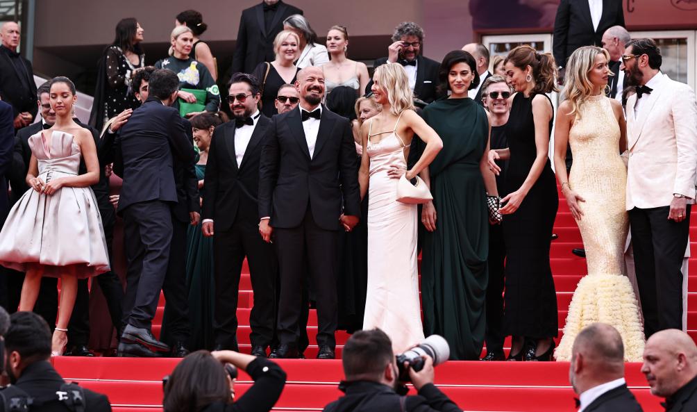 5月19日,在法国南部小城戛纳举行的第78届戛纳国际电影节上,瑞典导演塔里克·萨利赫(前中)携主创人员在主竞赛单元影片《共和之鹰》首映礼后离开。新华社记者 高静 摄